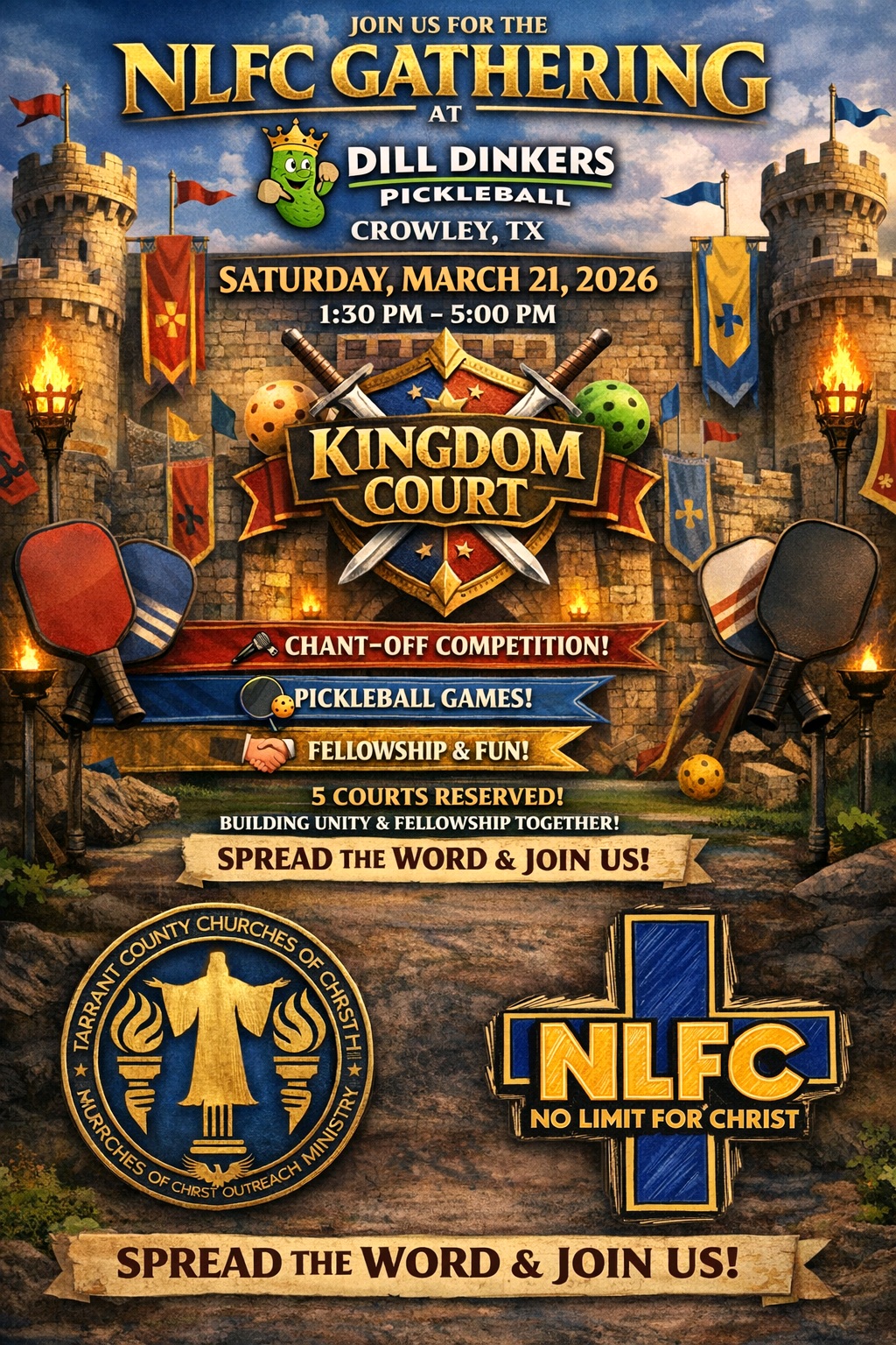 Get ready for the March 2026 No Limits for Christ (NLFC) Gathering. We’re taking over 5 courts at Dill Dinkers Pickleball in Crowley for an afternoon of high-energy competition, deep fellowship, and serious fun. This isn't just another youth event; it’s where unity meets the court!