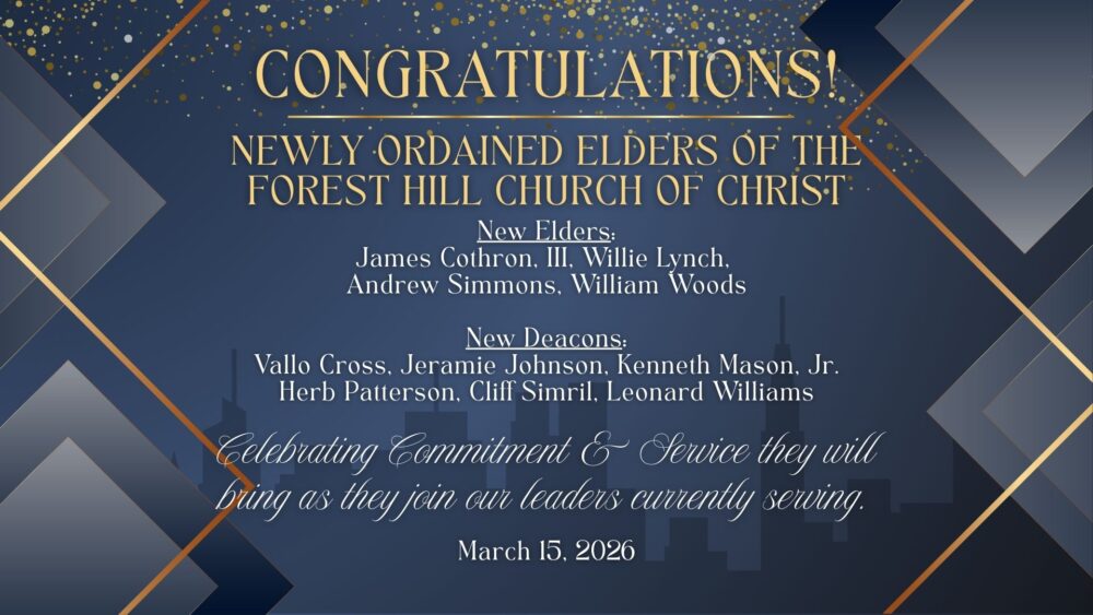 It is with profound joy and a deep sense of reverence that the Forest Hill Church of Christ announces the appointment of our newly ordained Elders and Deacons. These brothers have been called by the Holy Spirit and affirmed by the congregation to take up the mantle of leadership, protection, and service for the body of Christ.